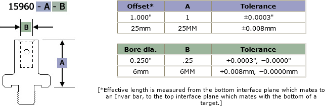 The 15960 target holders are designed to work with the Brunson Invar System. On one end, a 3/8"-24 external thread mates to our standard Invar System tubing. The other end provides a slip-fit holder for targets having either a 6mm or a 1/4" diameter shank. A brass thumbscrew allows you to secure the target without gouging the shank. Refer to the table below for dimensional tolerance. Alternate sizes are available upon request. Please contact sales for more information and custom pricing. This item is supplied with a spare thumbscrew. You may wish to read about our other Invar System Components as well.